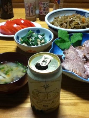 野菜のオリーブオイル焼き、鶏唐揚げを肴に軽井沢ビール プレミアムダークをいただきます。