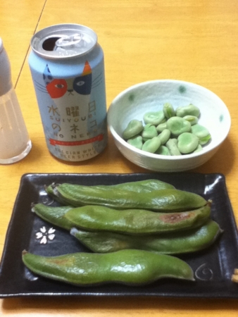 庭のソラマメを茹で、牛すじと蓮根と牛蒡の煮物を作りました。