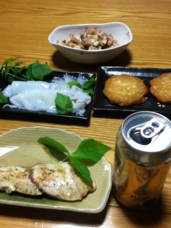 ヤリイカを刺身に鳥なんこつのガーリック焼き、シイラのハーブ焼き、玉ねぎ天を肴にバドワイザーのワールドカップ缶をいただきます。