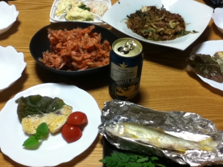 鮎が半額だったのでホイル焼きに、地海老の唐揚げ、鱈のスパイス焼きを作りました。