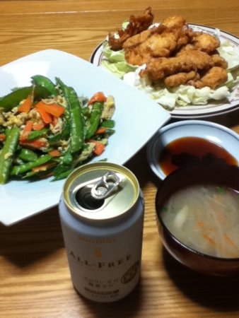 嫁さんはとり南蛮、私はサヤエンドウとニンジンの卵とじを作りました。
