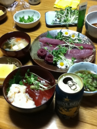 ハマチのお造り、マグロのづけ丼、もずく酢、玉子豆腐、お味噌汁と和風のおかずを揃えました。