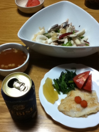 コウイカのオリーブオイル焼き、カレイのバター焼き、オニオンスープを二人で作りました。