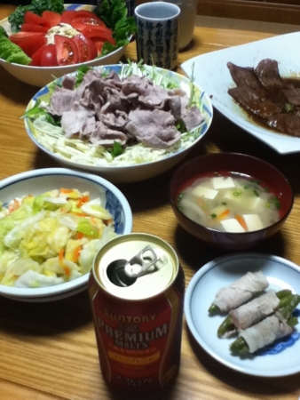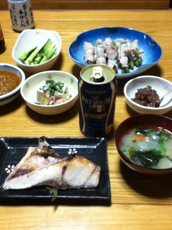 ブリ鎌塩焼き、インゲンの肉巻き蒸し梅肉添え、冷奴、もろきゅう、味噌汁と夏の和食メニューになりました。