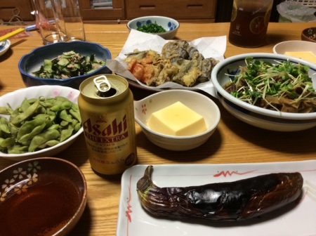 野菜の天ぷら、玉子豆腐、焼きなすを肴に