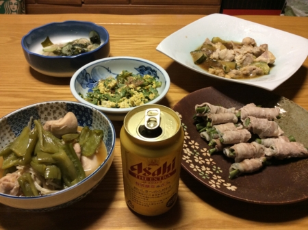 ゴーヤの卵とじ、キュウリと鶏肉の煮物、