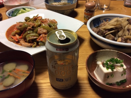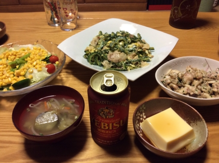 キュウリと鶏肉の炒め物、ゴーヤの卵とじ、