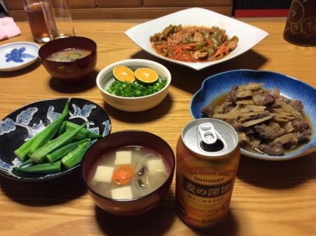 牛すじの煮込み、枝豆、キュウリとワカメの酢の物、