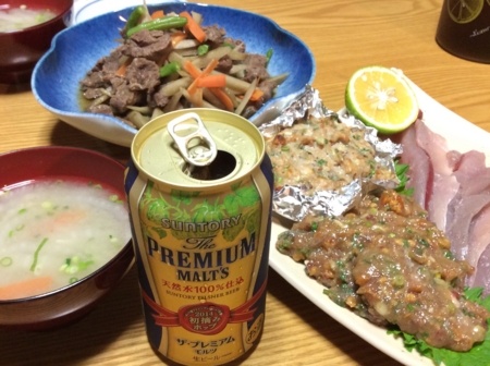休日は料理を嫁さんに任せて晩酌の一杯。