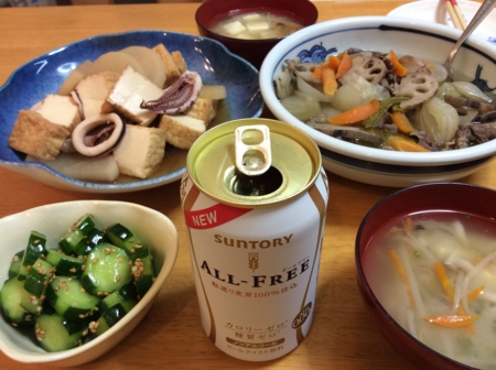 イカと大根と厚揚げの煮物、キュウリのごま油和え、
