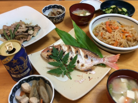 鳥とゴボウの煮物、味噌汁を作りました。