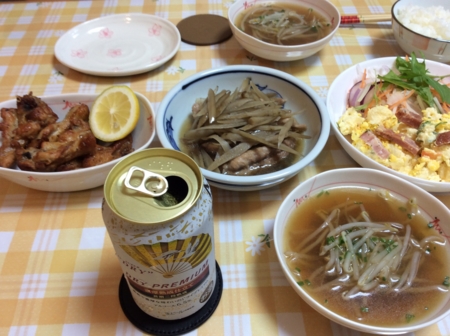 せせりとごぼうの煮物ともやしスープを作りました。