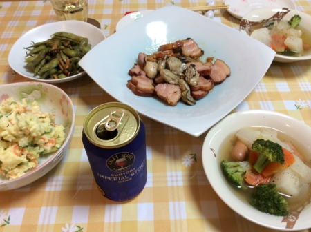 牡蠣とベーコンのニンニク炒め、枝豆ニンニク。