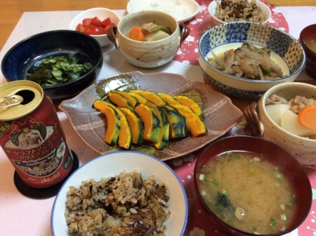 蒟蒻メインのきんぴらとひじきの炊き込み御飯と