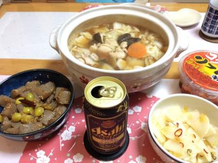 蒟蒻と銀杏のピリ辛炒めと鶏鍋を作りました。