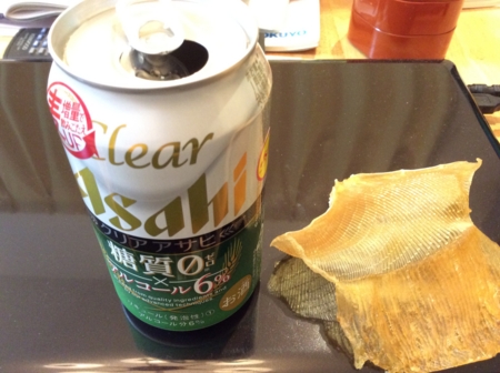 エイのヒレを炙ってクリアアサヒをいただきます。