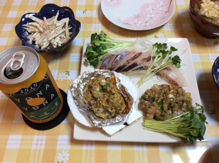 刺身なめろうさんが焼きの三品盛りにしました。