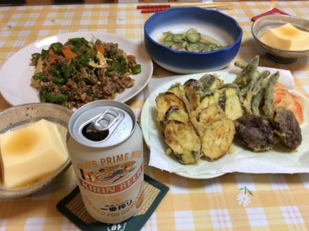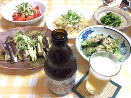 蒸しナス、トマトを肴に一番搾りをいただきます。