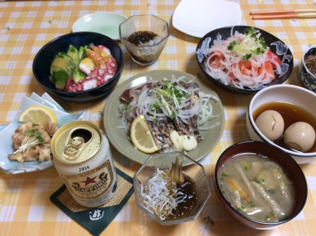タコとキュウリの酢味噌和え、トマトサラダ、