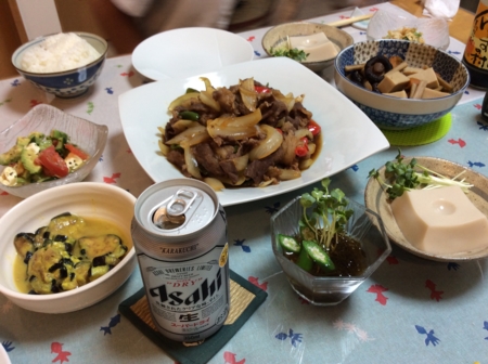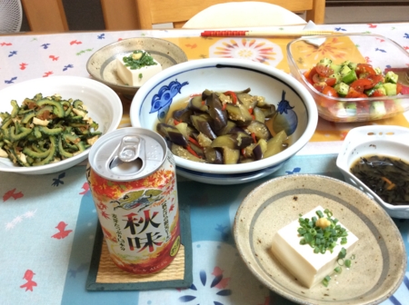 ゴーヤとササミの味噌炒め、ナスと赤ピーマンの煮物、