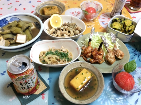 鶏皮ポン酢、ナスと揚げ豆腐の煮物、揚げ出し豆腐を作りました。