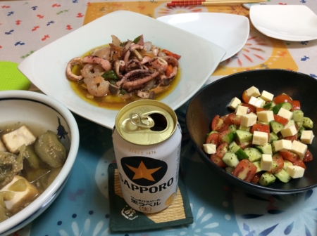 冷奴にキュウリとトマトのサラダを肴に