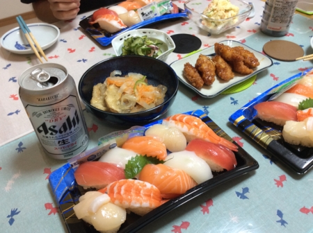疲れたので出来合いのお寿司とおかずで