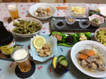 じゃこ天、タコとキュウリの酢の物、ひじき煮を肴に