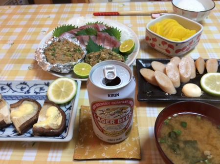 あとは焼き椎茸と伊方町のお土産のまぐろのソーセージ。