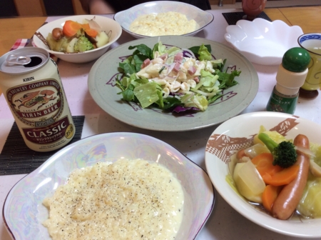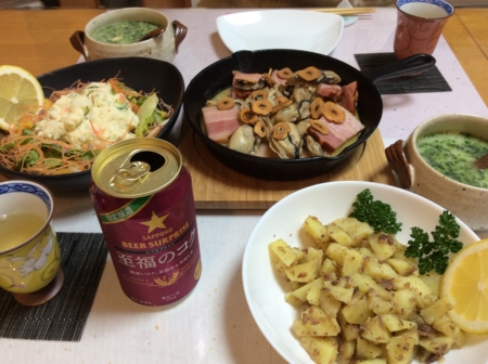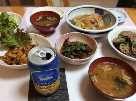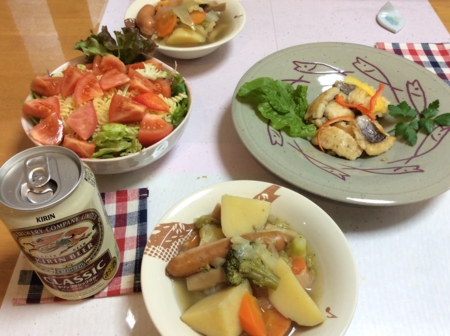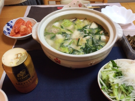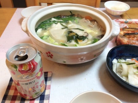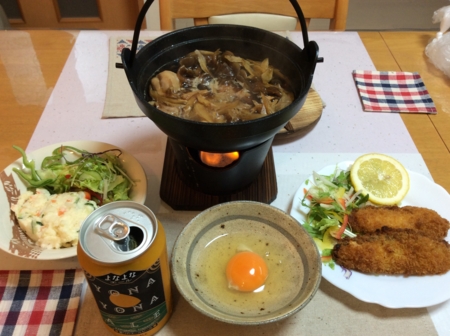 鶏ごぼう鍋とサーモンフライ、ポテサラを肴に