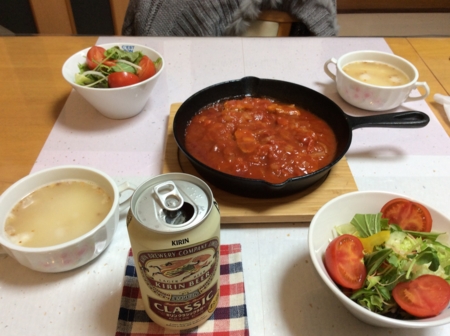 ポークソテーのトマト煮、ジャガベーコンスープ、
