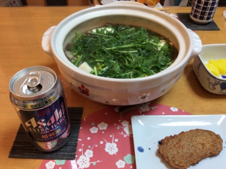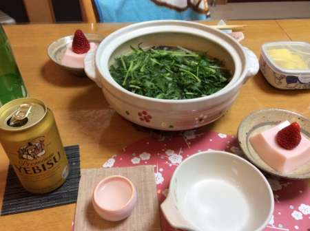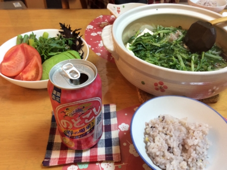 水菜と豚肉の鍋と雑穀ご飯を作ってもらいました。
