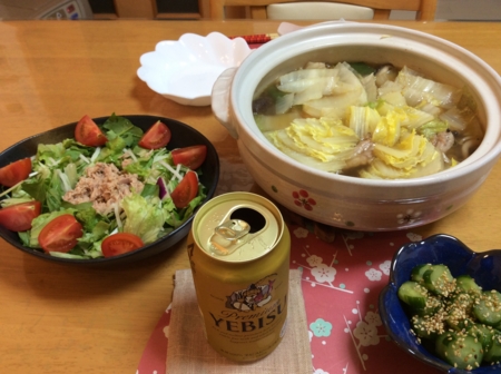 せせりと鶏団子と白菜の鍋ときゅうりのごま油和え、
