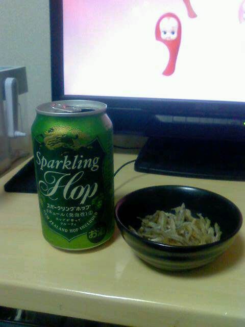 えびせんべいに、ホッピーストレート。アルコール0.8%。