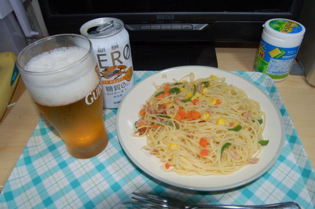 ツナと見切り品の炒め油でスパゲティをこさえて、ZER0で晩酌。