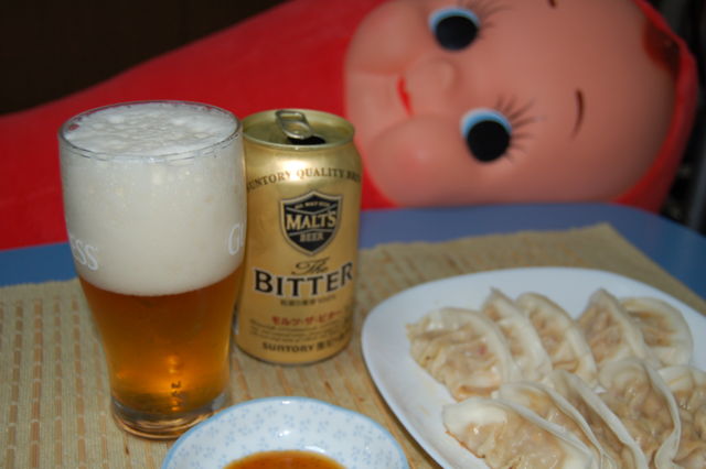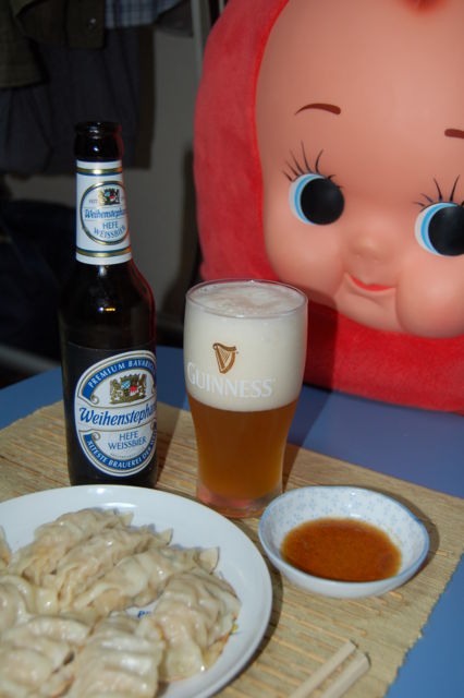 で、今夜は、地場産のチルド餃子を焼いて、昨日デパートで買ってきた白ビール。濃いなぁ。