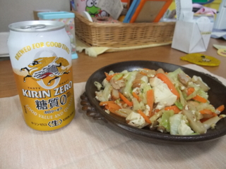 にら炒め、昨日掘ったじゃがいものサラダ、惣菜唐揚げ食べ比べ、おつまみちくわ、オリオン。