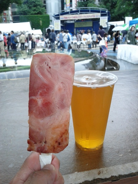 池袋西口公園で、いわて蔵ビールの東北魂、一関ミートのハムステーキ。