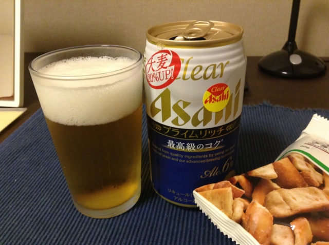 ネット直予約特典で、チェックインのときにクリアアサヒプライムリッチをもらった。
