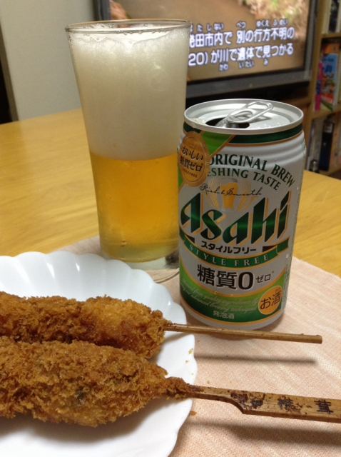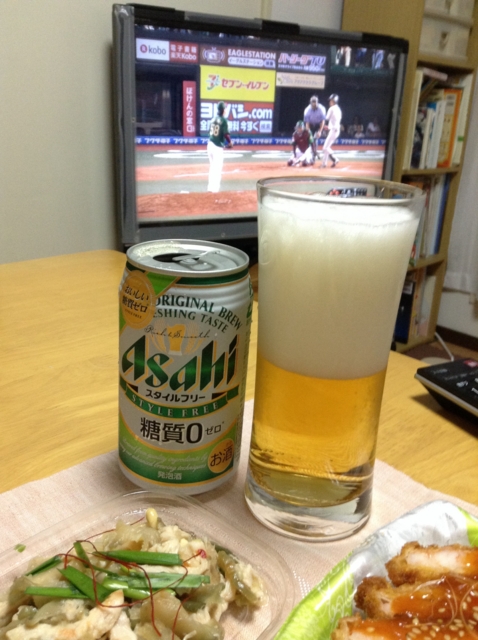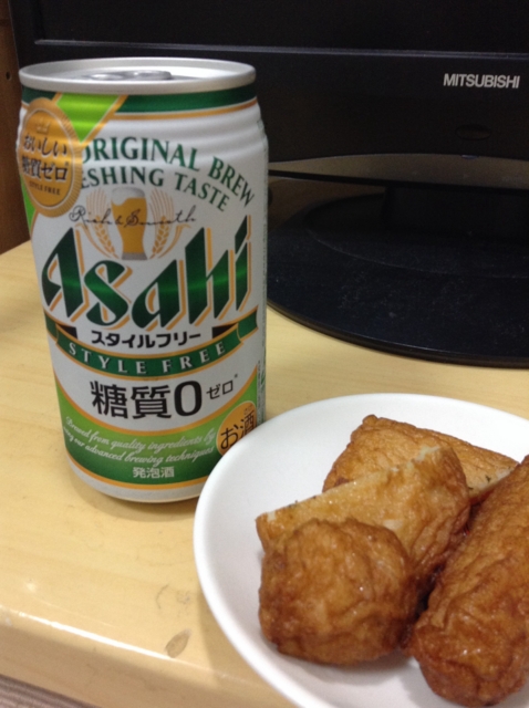 出張から戻った。主食を軽めにして、見切り惣菜でスタイルフリーを飲む。