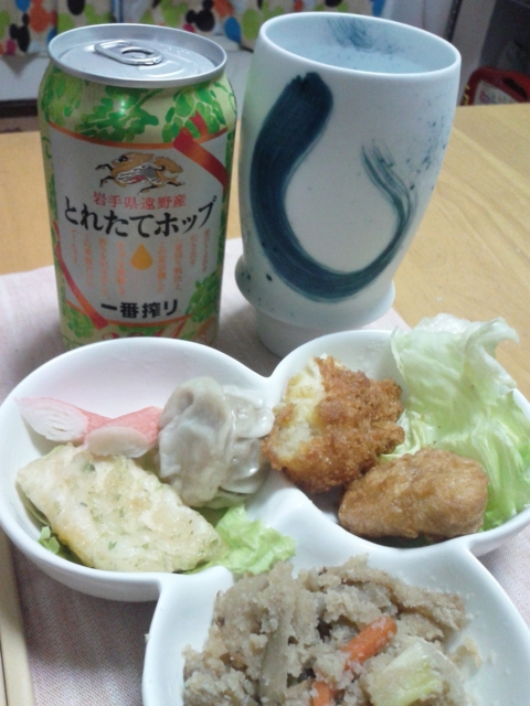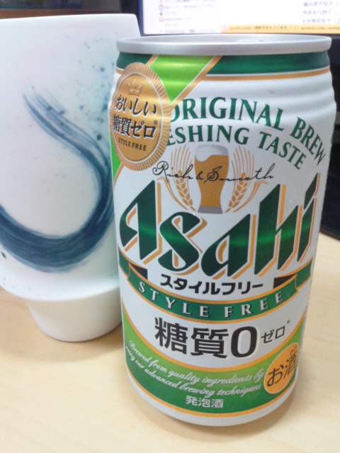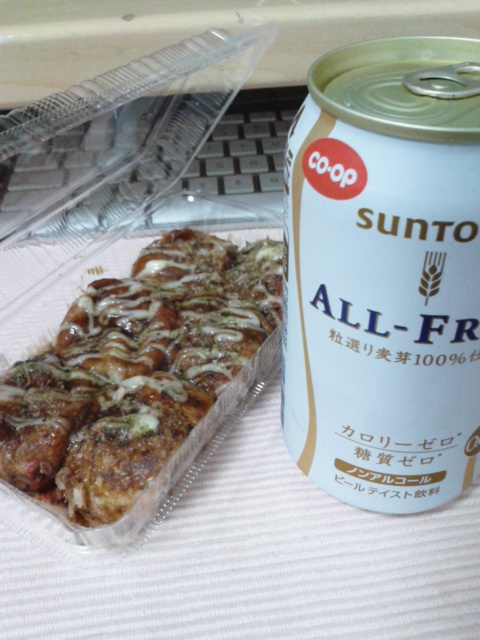 駅前の上木屋のたこ焼きと、オールフリー。本当は、イートインでスーパードライ生が飲みたかった。