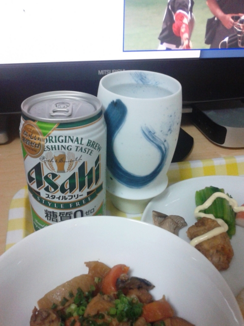 秋晴れの下でソフトボール、そのあと一杯、のはずが、娘が疲れで調子を落として、甘え続けて身動きとれず。自分も風邪っぽいから、オールフリー。