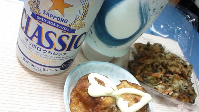 野球観戦からの帰り道の店が、どこも満員だったから、最後に寄ったたこ焼きバーで、持ち帰りをゲット。