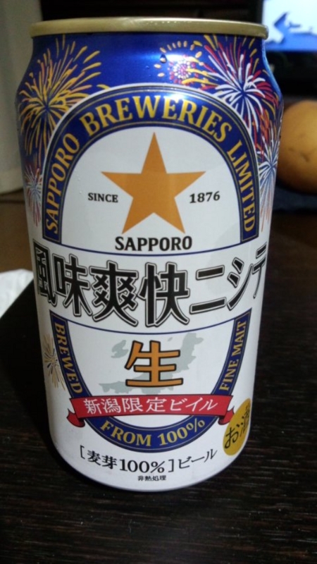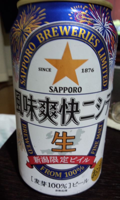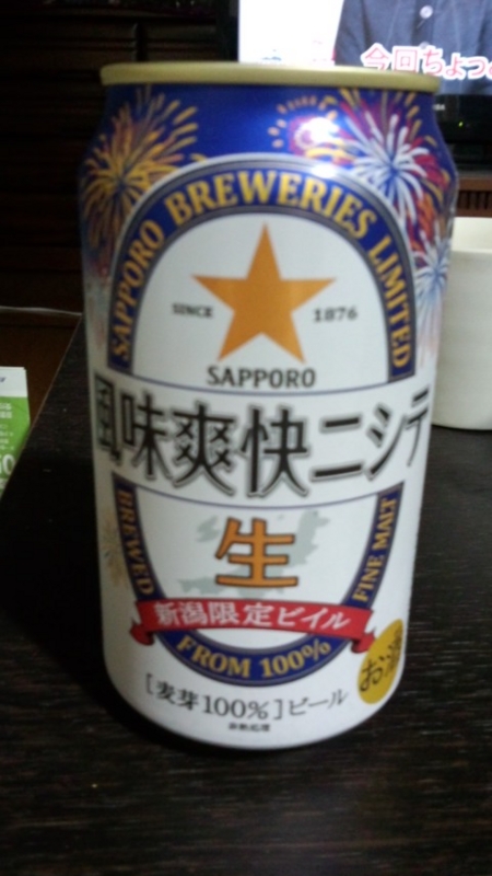 テレビで雨の降る諏訪湖の花火大会を見つつ、新潟限定ビイル、風味爽快ニシテいただいております。