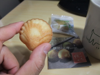 GWに買ってきた、鳥羽の土産菓子。あこや貝カルシウム入りらしい。さらに、土産用の折り箱の中身は、プレーン(写真)・伊勢茶・伊勢の柿の葉・あおさのり。