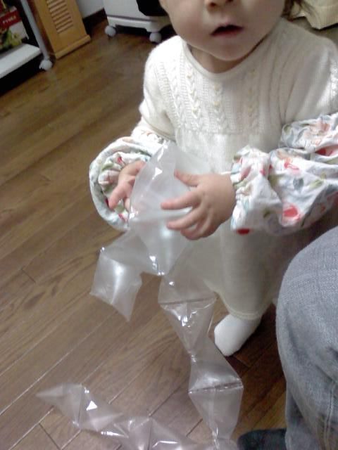 スポンサー姉・チョイス姪の、ディズニーシー限定ぬいぐるみが届いたので、開けてみせた。まずは梱包材のしゃかしゃかっぷりに夢中。