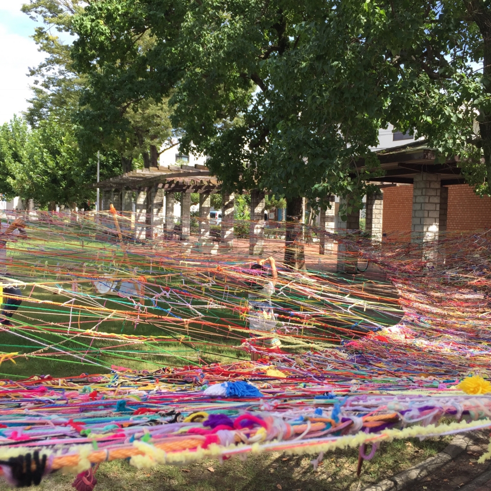 今日は自分的あいちトリエンナーレ2016に決着をつけるべく岡崎→豊橋を回ってきました。岡崎は一度9月に行ってるんですが10月から開催の催しがあってそこのスタンプが欲しくて…でも行ってみたらかなり並んで整理券をもらうようだったので退却、何のために行ったのかちょっとわかんなくなりましたが、一般参加型の、毛糸などを自由に結び付けていくオブジェが3週間で成長していたのでまたにぎやかしてきました。
