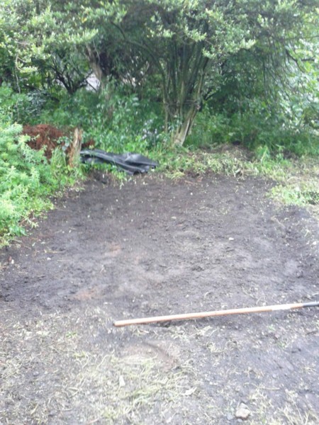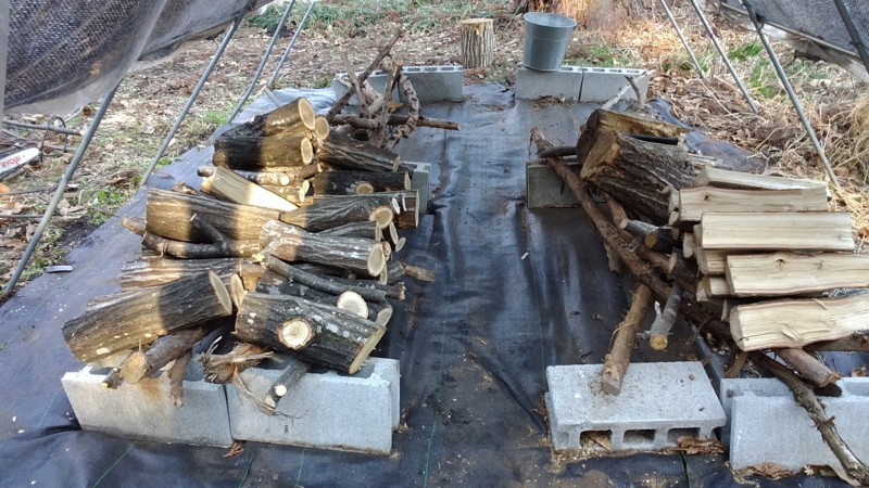 まず薪小屋の残りの薪を割って、薪小屋の半分を掃除します。落ち葉とかおが屑とか何者かが放置したり、食い散らかしたクルミやクリなどでイッパイなのです。これが土になると雑草がスキアリ!とばかりに繁茂しますからね。