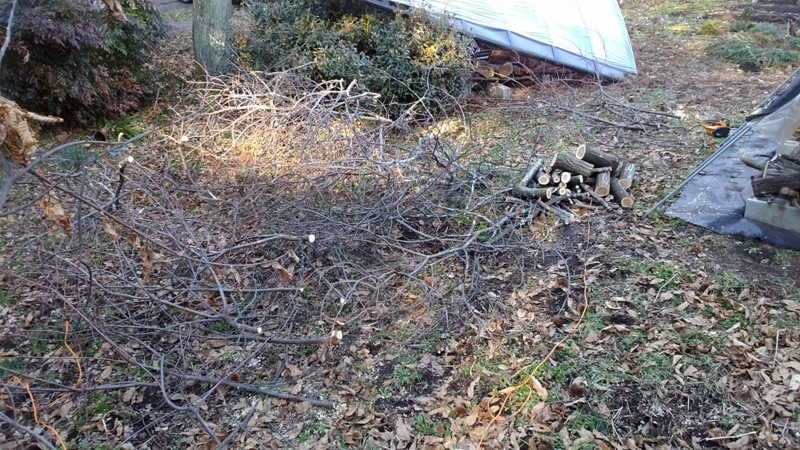 先月枝打ちした枝を片づけます。こんな感じで切りっぱなしジャーマン(放置)してました。