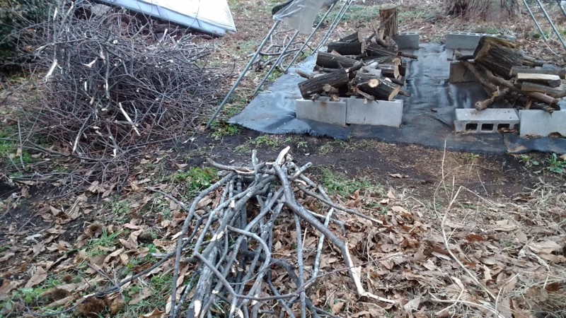 ここからがもっとたいへん。細かい枝を鉈で分別します。左が風呂の焚き付け用、手前が風呂用の薪。わかりづらいけど、奥に農作業などで使う用に長め切り出したのもあります。